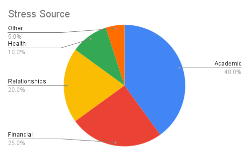 Insight: Academic and financial pressures make up nearly two-thirds of stress factors, showing that external demands play the largest role in student anxiety.